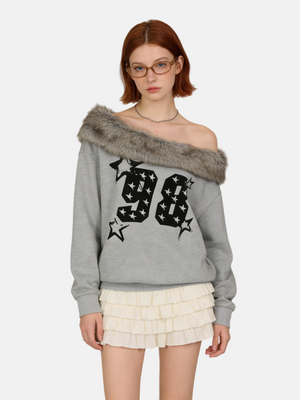 Haaura Faux Fur Collar Off-The-Shoulder Sweatshirt