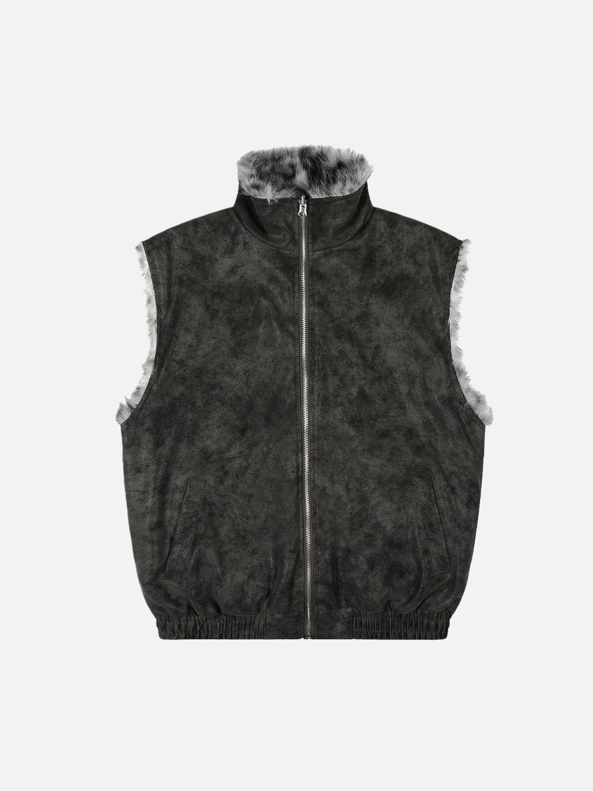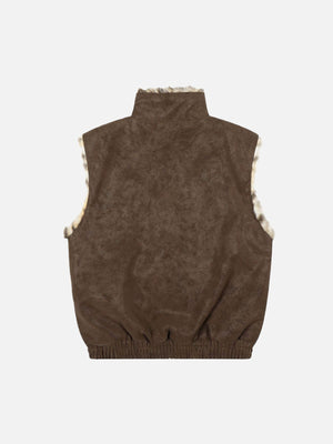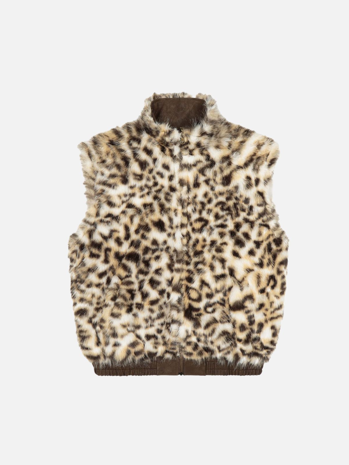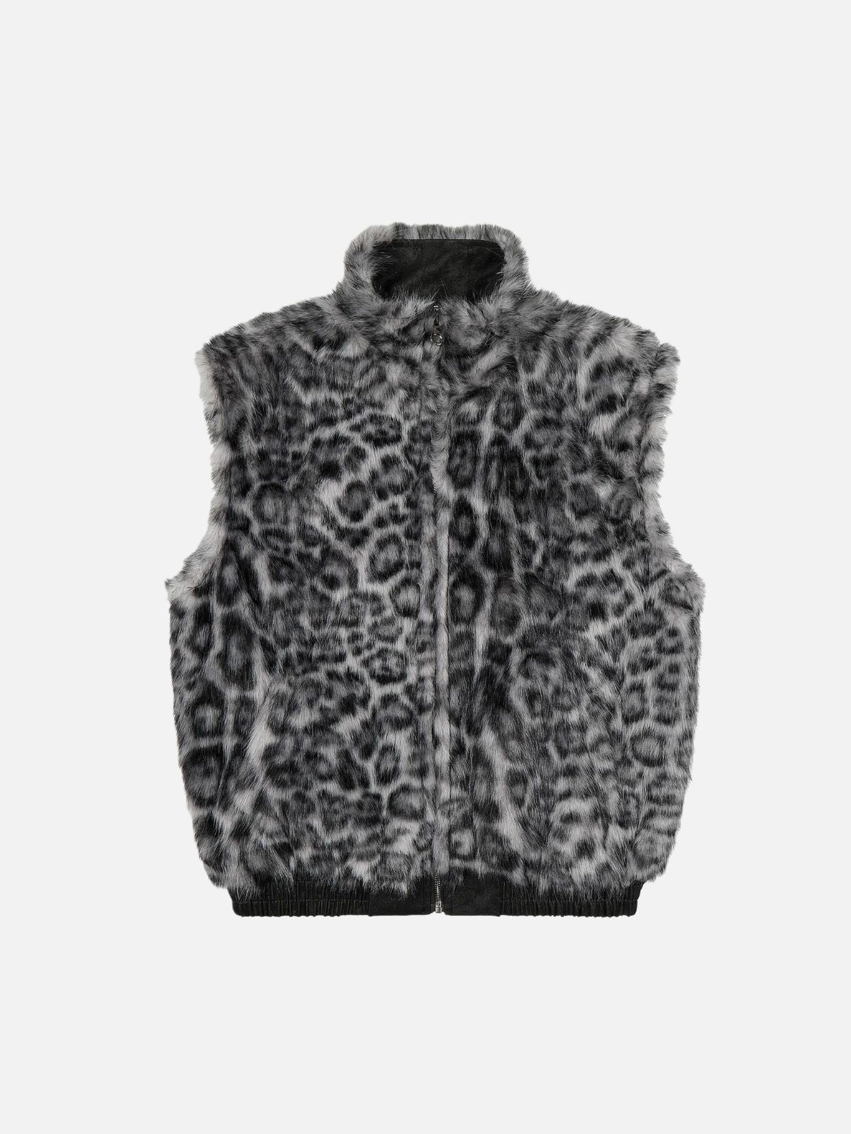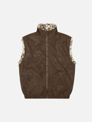 Functional Patch Pockets: Two large front patch pockets with flap closures offer practical storage and highlight the leopard trim, enhancing the vest’s utilitarian appeal.