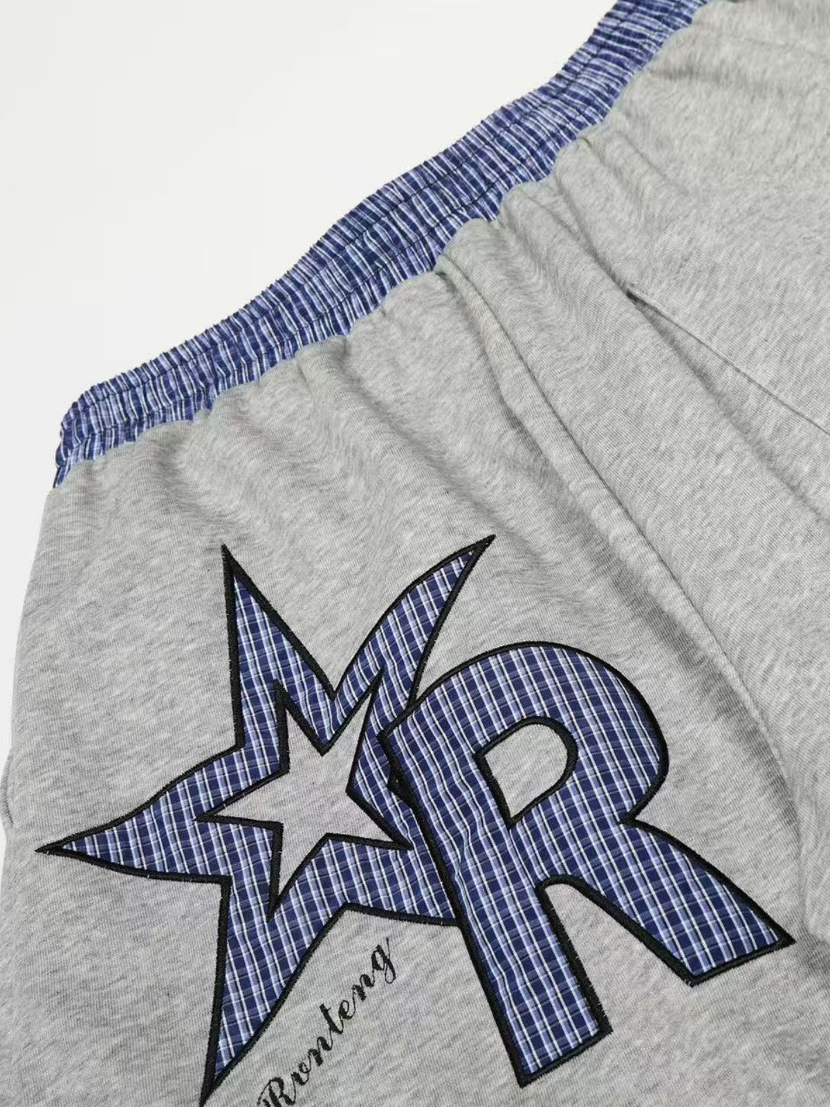 Light gray joggers with a blue-and-white plaid waistband and drawstring -
