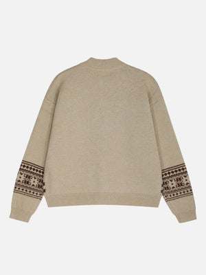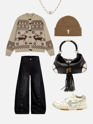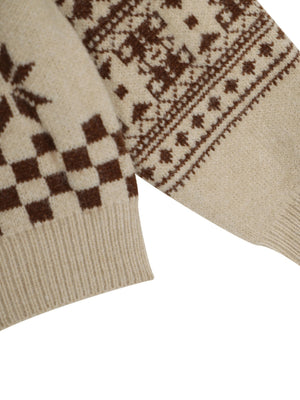 Classic Fair Isle Pattern: Features a traditional all-over jacquard knit with symmetrical reindeer, delicate snowflakes, hearts, and geometric checks in rich browns, embodying cozy Nordic heritage.
