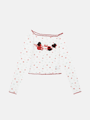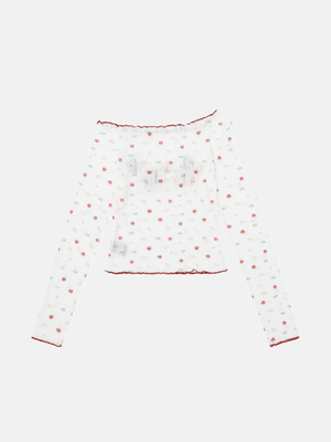 Haaura Strawberry Cat Embroidered Off-Shoulder Top