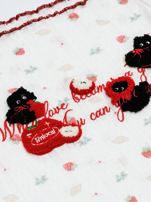 Sweet Narrative Embroidery: A central embroidered scene of two cuddling cats and a strawberry, paired with a romantic red-stitched slogan, creates a unique and endearing focal point full of personality.